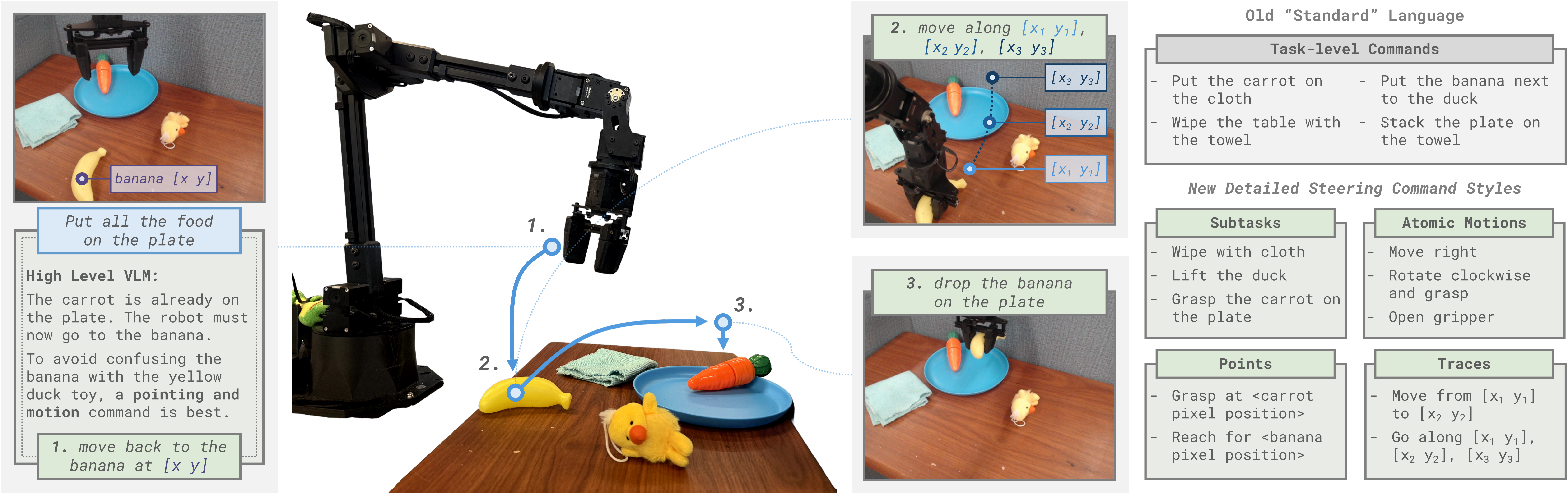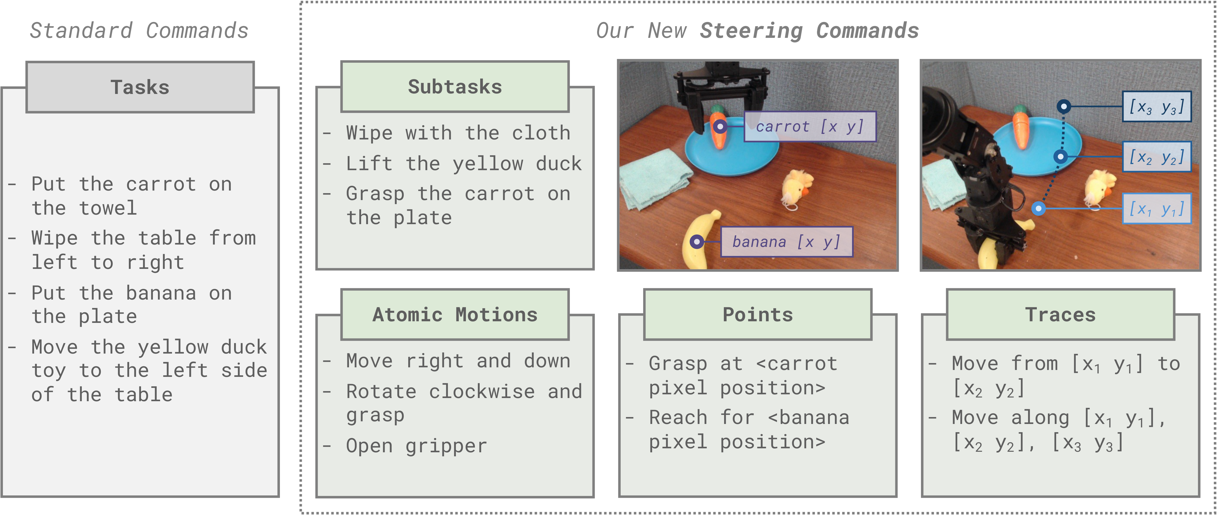 We thus train our policy on steering commands: a diverse set of instructions spanning many styles and levels of abstraction. Beyond standard task-level commands, we also include: