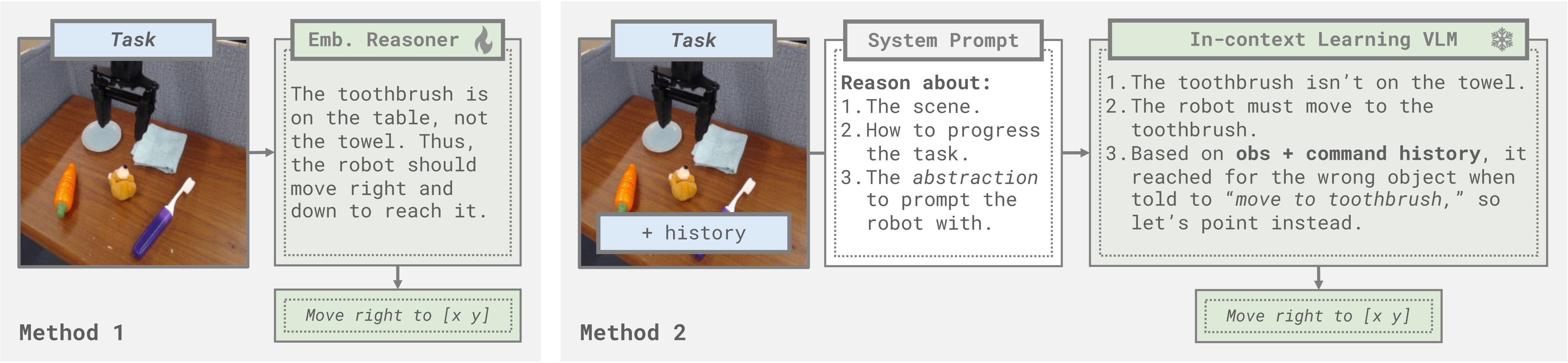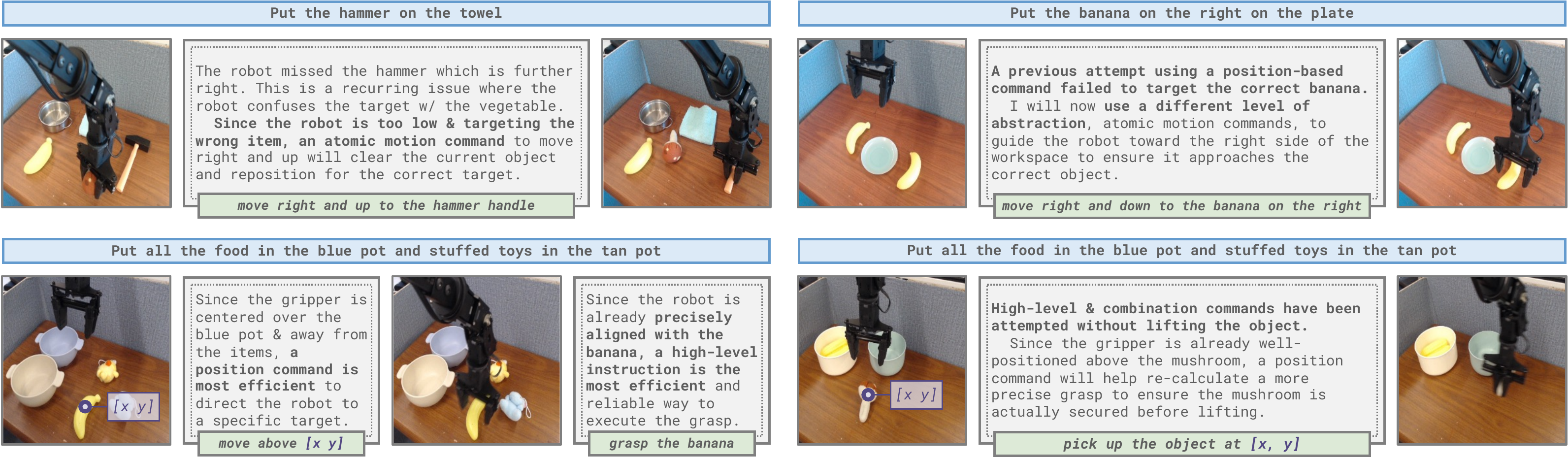 Steerable Policies also allow VLMs to leverage in-context learning, where the model reasons to select a steering command style, observes the resulting behavior, and iteratively refines its commands to adaptively improve on the task. This approach casts robot in-context learning as standard vision-language in-context learning, obviating the need for structured scene and action representations that prior robot in-context learning methods rely on.