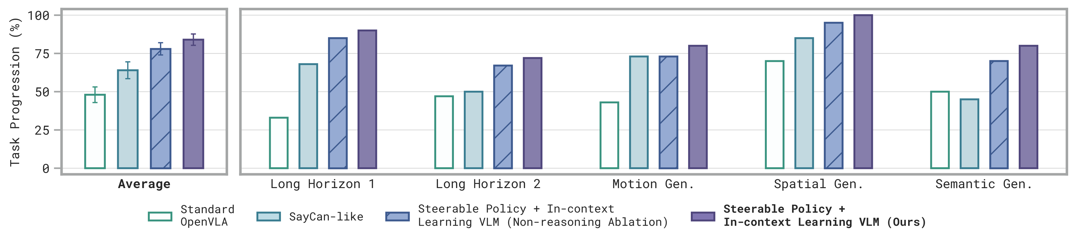 As in-context learning is used to select the appropriate level of abstraction for steering the robot, this approach is uniquely enabled by our Steerable Policies, as past VLAs are only trained on one or two steering modalities. We find our approach outperforms a SayCan-like baseline (where the VLA is restricted to subtask-level commands), confirming the performance benefits of in-context learning over many prompting modalities.